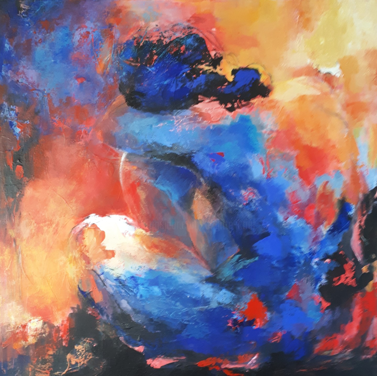 Un personnage féminin vu de dos, la tête dans le bras appuyé sur un genou, rêve.