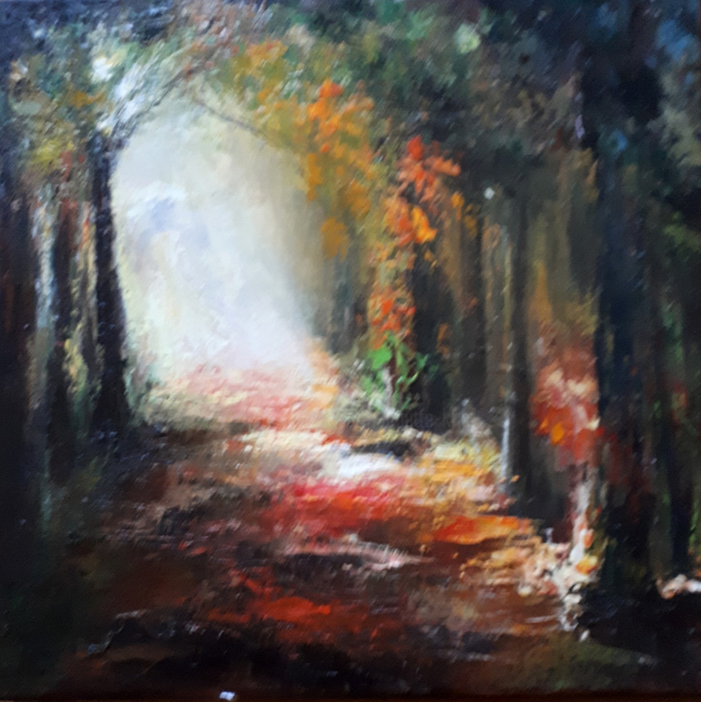 Trouée 4: un personnage féminin en robe blanche, tenant son chapeau, apparaît dans la lumière qui inonde le sous-bois.